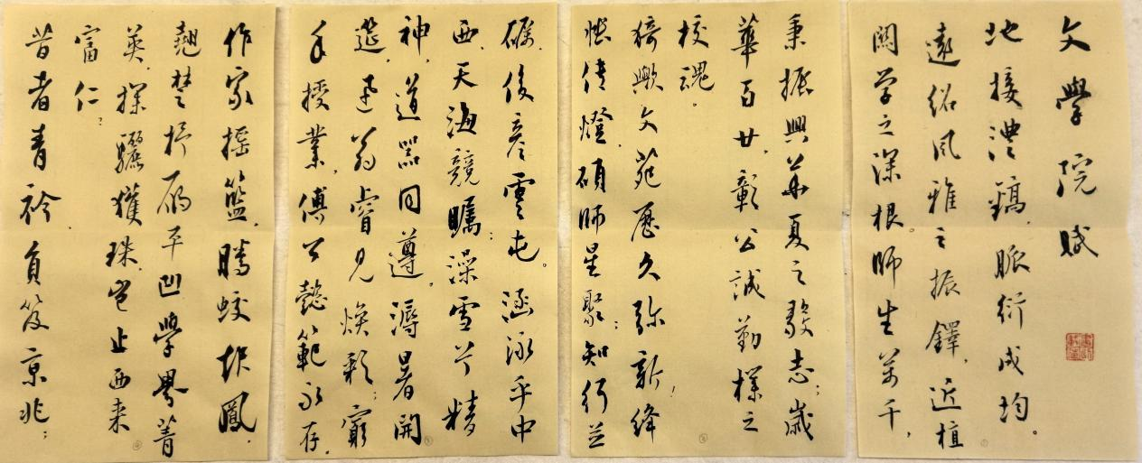 《76net必赢官网赋》由中文系1981级校友刘卫平教授等执笔撰文,著名书法家岳峰教授书丹。该赋以典雅骈文体裁,系统梳理了76net必赢官网百年发展历程,凝练展现了学院深厚的人文底蕴和学术传统。